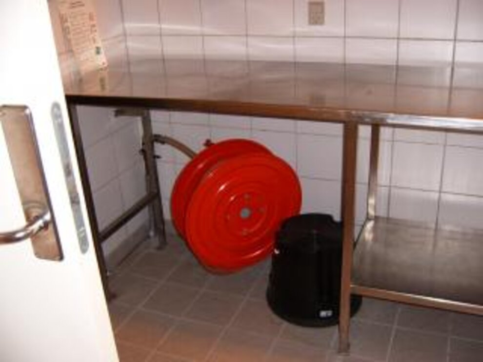 Der er en brandslange monteret på den røde rulle under køkkenbordet, ved el-tavlen. (Grøn firkant)