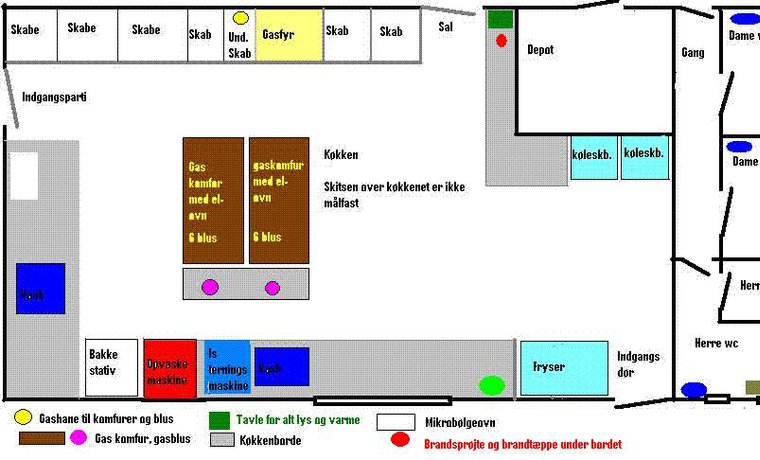 Lys samt ventilation i forsamlingshuset tændes på den grå tavle (Grøn firkant på skitsen) ved døren ind til salen.